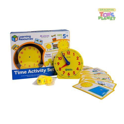 From beginners to advanced learners, this Time Activity Set will engage children. They will learn to identify the hour and minute hands, learn the difference between analogue and digital time, identify time to the hour, half hour, and more! Educational Benefits *Learning Style: Visual, Tactile *Skill Development: Telling time, Time matching (analogue and digital), Writing time (analogue and digital), Problem solving, Fine motor skills, Self-help Includes *Plastic clock with movable hands, Write & wipe clock, 24 Double-sided analogue and digital puzzle cards, 12 Double-sided, write & wipe daily activity cards, 3 Time dice, Activity Guide