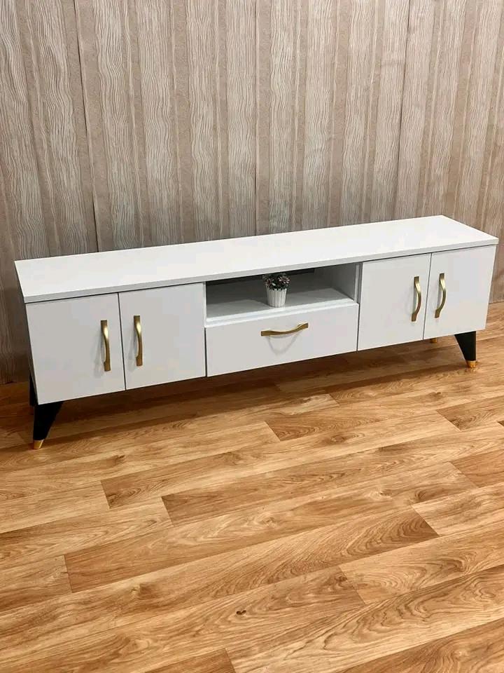 Modern Elegance for Your Living Room. This sleek TV stand combines function and style. It has a glossy white finish, gold accents, and bold black legs. Designed to elevate your space while keeping it organized. - Custom sizes available - Color options on request - Timely delivery
