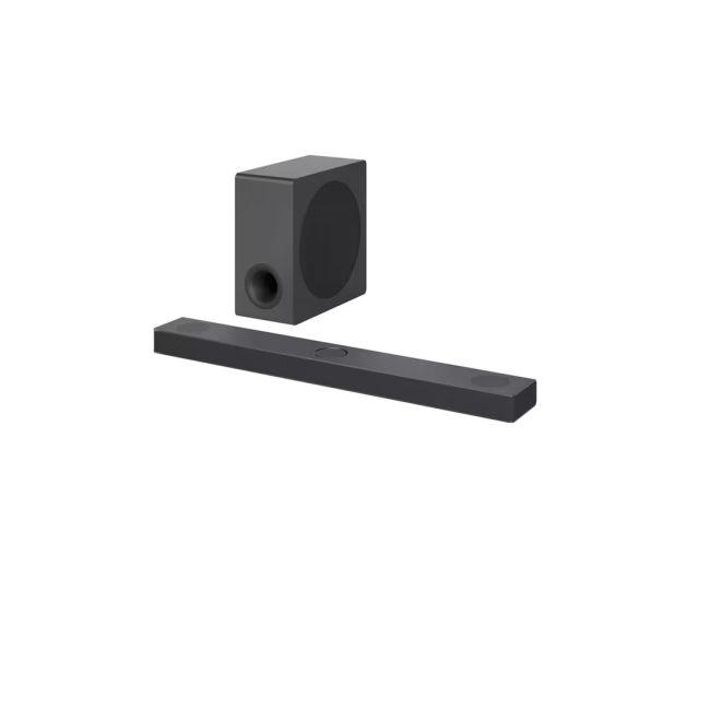 The LG SC9S is a 3.1.3 channel soundbar system delivering 400W of total power, featuring Dolby Atmos, DTS:X, and IMAX Enhanced support for immersive audio experiences. It includes a wireless subwoofer and three up-firing speakers—two for height effects and one dedicated to enhancing dialogue clarity by projecting voices upward to align with on-screen action. The system incorporates AI Room Calibration Pro to optimize sound based on your room's acoustics and supports High-Resolution Audio up to 24bit/96kHz. Connectivity options encompass HDMI eARC with 4K, Dolby Vision, and HDR10 passthrough, as well as Bluetooth, Wi-Fi, USB, and optical inputs. The SC9S is compatible with Apple AirPlay 2, Chromecast, Amazon Alexa, and Google Assistant, and offers features like WOW Orchestra and WOW Interface for seamless integration with select LG TVs. It is also rear speaker ready, allowing expansion to a 5.1.3 channel setup with the optional SPQ8-S kit. The soundbar measures 38.4" x 2.5" x 4.9" and the subwoofer measures 8.7" x 15.4" x 12.3", with both components designed to complement modern home entertainment systems.